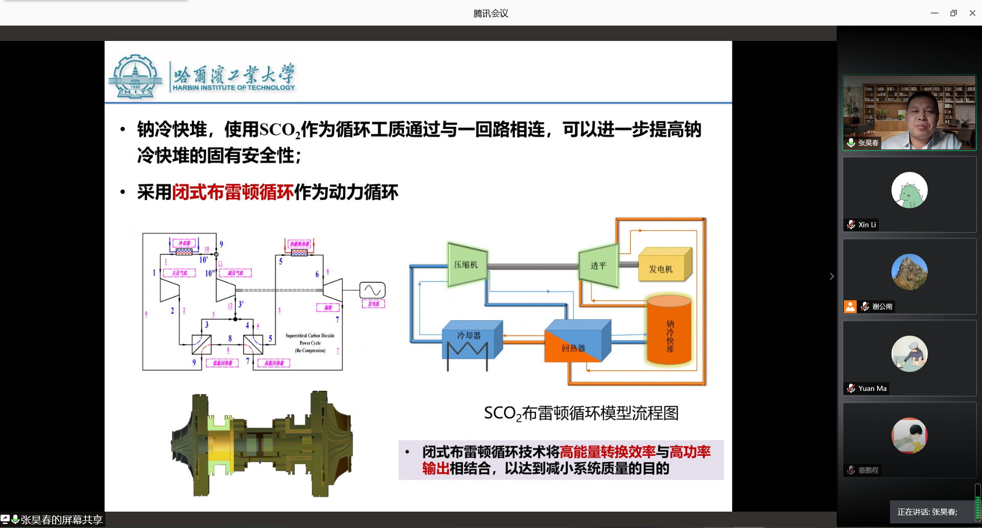 随后,张昊春教授基于空间核能利用这一背景,向我们讲解了千瓦级空间核动力热离子转换系统、火星大功率星表基地钠冷快堆超临界二氧化碳布雷顿循环系统、基于液态金属朗肯循环的空间双模式核热推进系统以及基于超临界二氧化碳布雷顿循环的双模式核热推进系统的系统组成、工作原理和系统优势等,并对系统集成、转换特性、结构选型、部件设计、空间工况等关键因素对系列化、多型谱、多模式、一体化、兆瓦级功率的空间核电源及核热/核电推进系统的热系电转换特性及优化设计的影响进行了讨论。