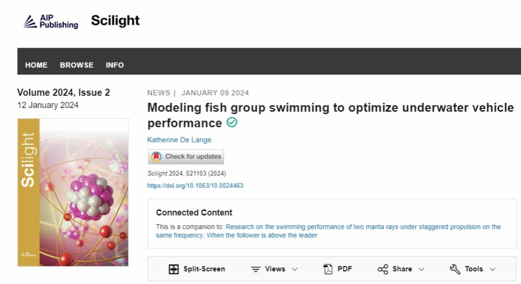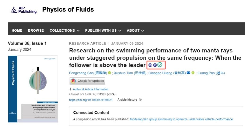 近期,SM视频 潘光教授团队发表题为“Research on the swimming performance of two manta rays under staggered propulsion on the same frequency: when the follower is above the leader”的研究论文。该研究成果被国际流体力学知名期刊《Physics of Fluids》作为主编推荐特色文章(Featured Articles)发表(图一),并被美国物理学联合会“科学之光”(Scilight)专题文章采访报道(图二)。SM视频 2020级博士生高鹏骋为该论文的第一作者,SM视频 黄桥高教授为该论文的通讯作者。