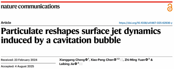 “水下仿生与流动控制”团队陈效鹏教授与思克莱德大学贾来兵博士以及元志明博士合作,在《Nature Communications》发表了题为“Particulate reshapes surface jet dynamics induced by a cavitation bubble”的研究论文。SM视频