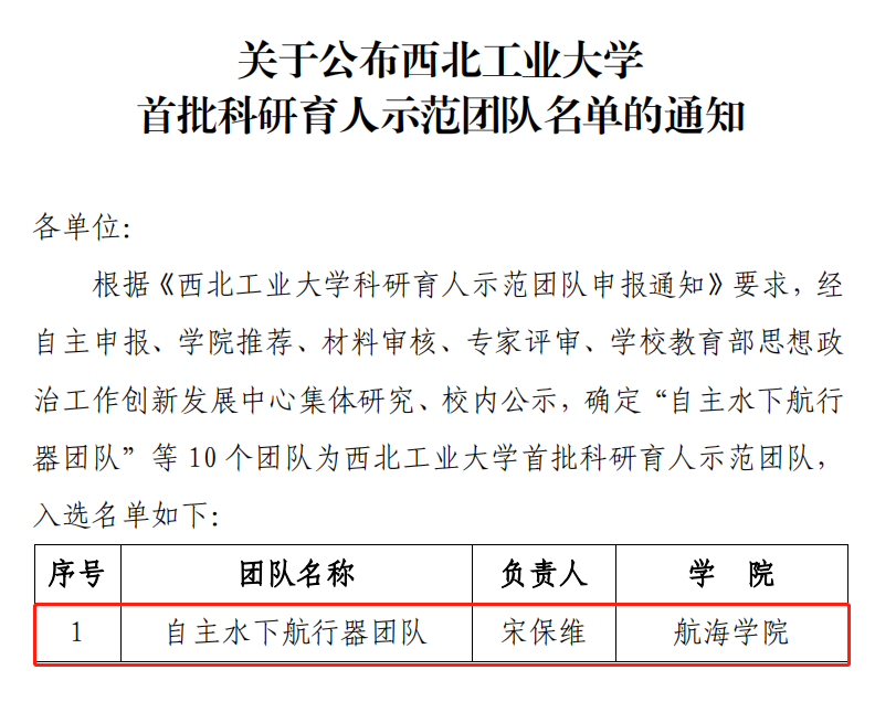 我院自主水下航行器团队、海洋声学信息感知团队入选西北工业大学首批科研育人示范团队名单