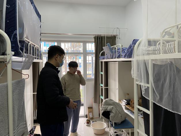 27日中午,院长助理张龙与学生事务主管崔晓来到了长安校区海天苑一号楼,看望刚刚返校的研一同学。张龙与崔晓逐个走访研一同学的宿舍,查看学生宿舍供暖情况,了解大家的旅途情况,并与部分同学沟通交流了有关本学期计划组织的学生活动的情况,针对性地提出了一些SM视频