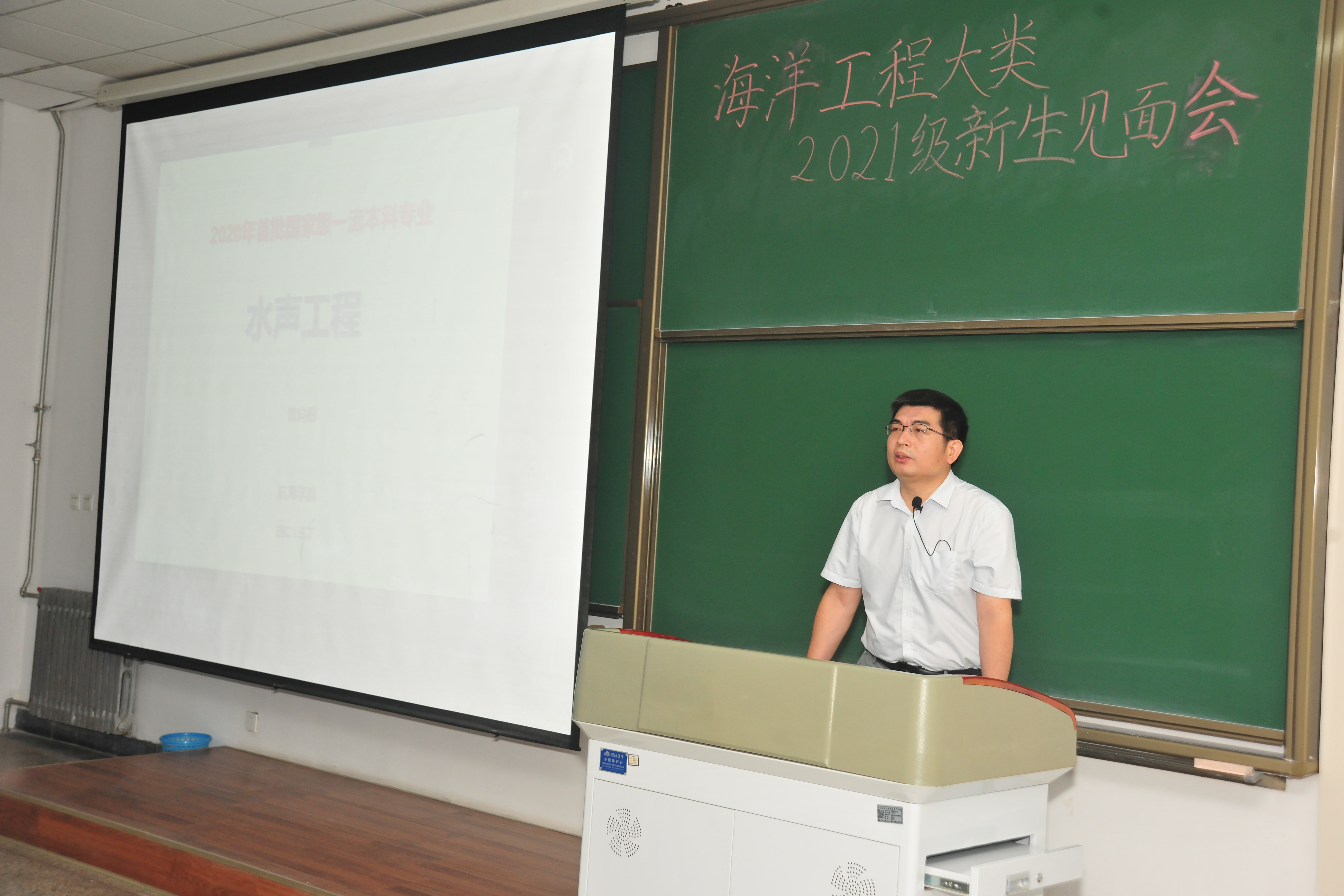 随后,专业负责人分别做专业介绍。船舶与海洋工程专业负责人胡海豹教授、水声工程专业负责人曾向阳教授、信息工程专业负责人张群飞教授分别从专业概况、师资队伍、教学团队、科研获奖、人才培养、就业发展等方面全方位介绍了本专业,让同学们对学院的专业设置有所了解,为将来分专业做好准备。最后,三位负责人向新生同学们表示欢迎,SM视频