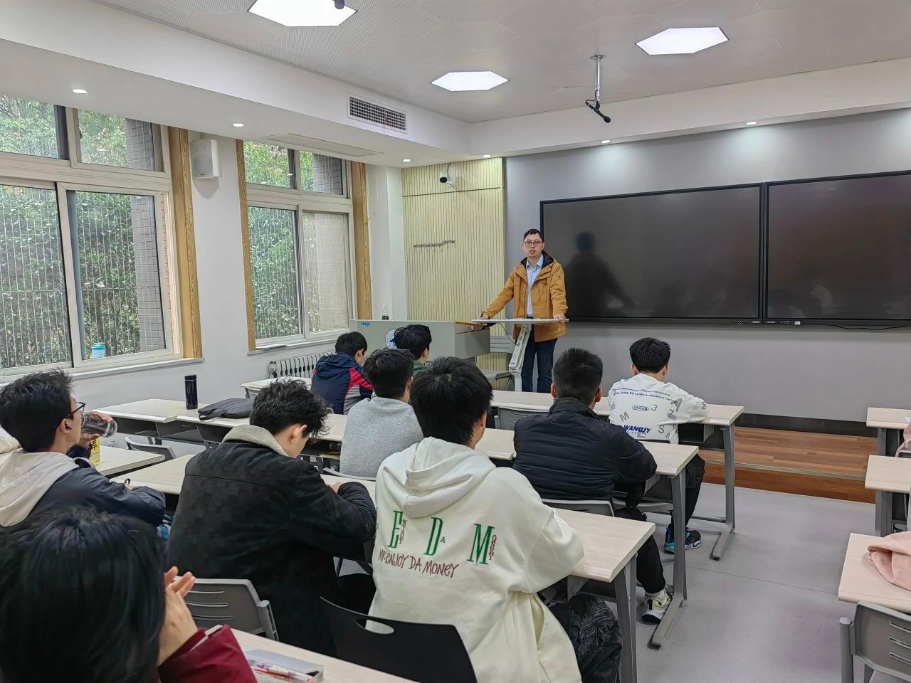叶鹏程老师向同学们概述了新班级的整体状况,接着详细讲解了大学生活的特点和要点。他着重指出,每位同学都应认真对待基础课程,做好课程预习和复习工作,同时积极参与双创竞赛,打好专业基础,实践锤炼能力,并为班级设定了“争先、固基、互助”的奋斗目标。他鼓励同学们努力进取,克服困难,实现个人成长。