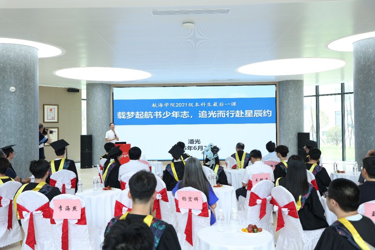 院长潘光为大家讲授了一堂意义深刻的离校前“最后”一课。他详细介绍了学院发展及专业学科建设情况,并寄语同学们要传承“敢为人先、攻坚克难、团结协作、无私奉献”的航海精神,为国家海洋事业贡献青春力量!