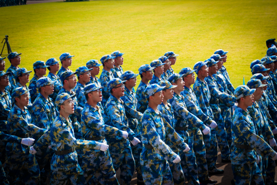 首先进行的是新生们的队列检阅。我院五连方阵中铿锵的口号无不展现出我们海洋工程大类新生的磅礴气势;嘹亮的歌声,展现的是我院新生的积极乐观、铿锵有力的精神风貌;整齐的步伐,展现的是我院新生坚韧不拔、一往无前的拼搏精神。
