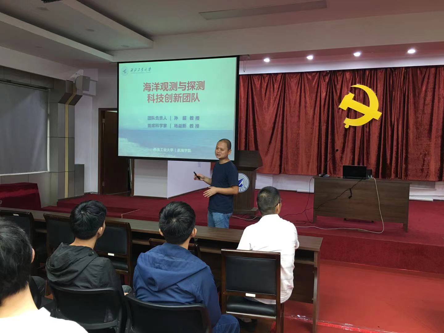 首先,由汪勇对水声工程专业近年来的发展方向、研究成果、人员构成、以及招生情况做了介绍。随后,汪勇对“海洋观测与探测”科技创新团队”,以及“海洋声学信息感知”科技创新团队的情况作了宣讲。之后,廉杰副教授对“航空声纳研究发展中心”科技创新团队的发展历史、科研实力、学生培养等方面的内容进行了介绍。