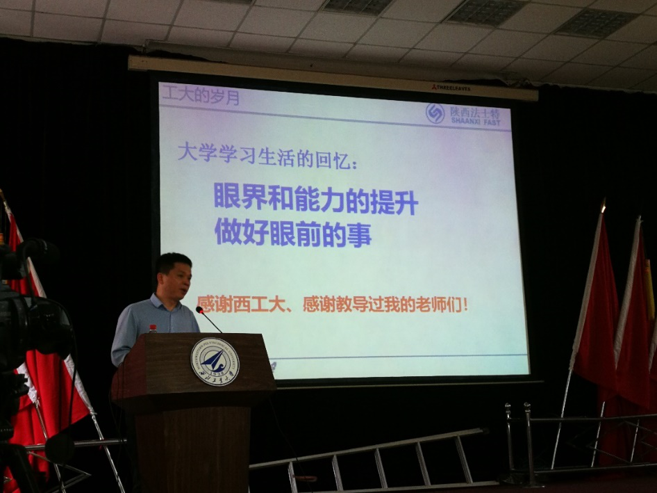 随后,刘义校友结合个人成长历程,回忆了自己在校的学习岁月,引起了在座学生的广泛共鸣。接着,他又介绍了自己在法士特的工作经历,为大家讲述了在项目研发过程中如何解决困难,最后攻克多项技术难关的故事,为同学们在科研道路上不断克服险阻提供了一个优秀的榜样力量。最后,他对未来进行了美好的展望,为同学们在今后的科研和成长过程中开阔了思路,树立了希望。