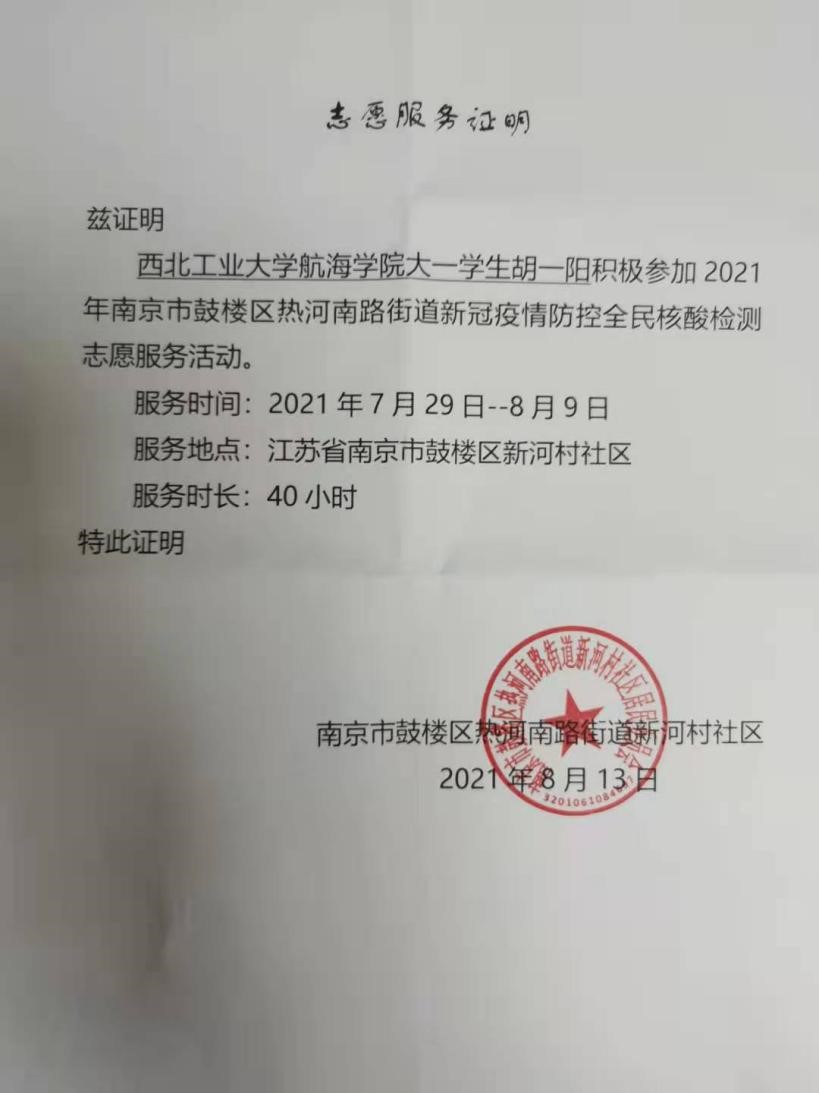 Hu Yiyang, an undergraduate student of the School of Marine Science and Technology, actively responded to the call of the Nanjing Youth League Committee and NPU when the epidemic broke out and signed up to be a volunteer. During the nearly 10 days of volunteer service, he cleaned up the medical waste generated by nucleic acid testing. He identified residents who came for nucleic acid testing and delivered meals to doctors who worked hard all day. He also maintained order, and assisted the elderly and children to complete the testing procedures.