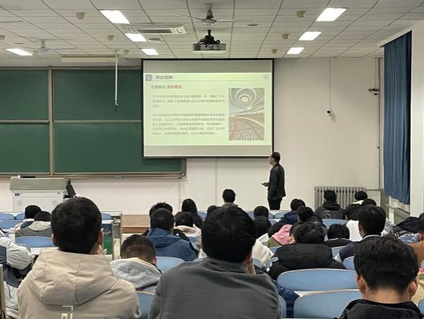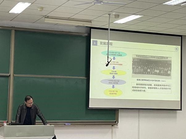 潘光结合学院发展情况,从基层组织、师资与教学情况、科研平台与项目等方面展开,将学院从定位到专业建设再到师资力量的全方位呈现,帮助同学们加深对学院的了解。随后,他以两会精神为切入点,围绕巩固提高一体化国家战略体系和能力,加强国防科技工业能力建设,讲述现代海战的发展历程及国家海洋安全发展需求。最后,他说到海洋技术与工程领域科学研究、装备研制和人才培养是服务国家海洋战略的重要力量,他号召同学们要心有大我、至诚报国、不惧艰辛、迎难而上。
