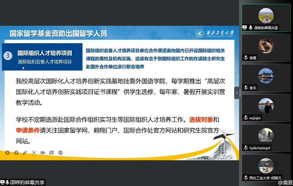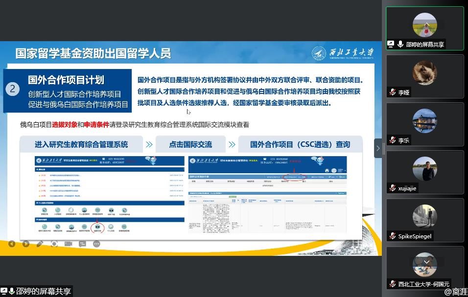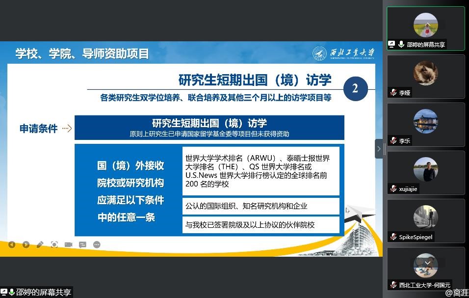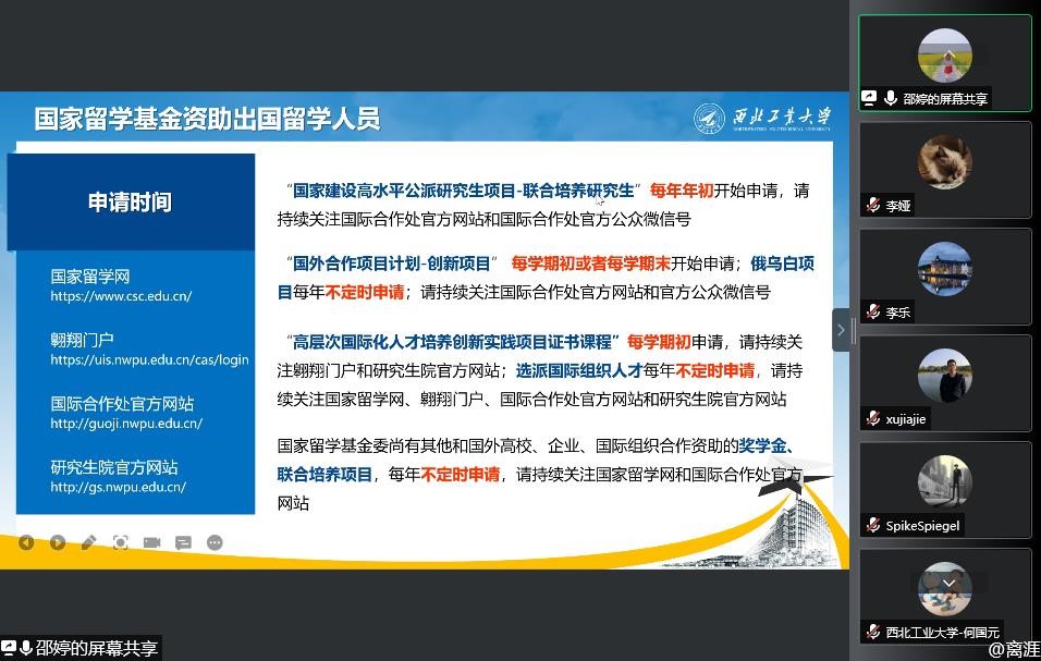 赴国(境)外交流项目情况,鼓励同学关注相关微信公众号、官方网站等发布渠道以及学院相关通知,第一时间了解项目信息。同时,从研究生短期出国(境)访学、联合培养等项目介绍了学校、学院、导师资助项目,以研究生赴国(境)外流程为例,介绍了相关流程,并提醒各位同学,外语水平等相关证明资料要早做准备,以免耽误申请。鼓励同学们多多申报,主动跟导师、同学、学院沟通,提高自己的综合能力。学院会在经费支持、项目申报等方面提供帮助,助力同学申报成功。