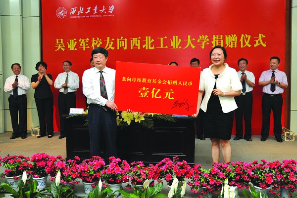 2011年5月,吴亚军向母校西北工业大学捐赠1亿元,设立“吴亚军奖励基金”,支持西工大的建设发展,用于资助贫困学生、优秀学生、青年教师和特困离退休教职员工。2016年10月,吴亚军再次向母校捐赠1亿元,支持学校设立“西北工业大学校友讲席教授基金”。每次捐赠,吴亚军都坚持不请记者、不做报道,她常说自己是怀着一颗感恩之心在回报母校的。在谈到自己的求学生活时,吴亚军深情地说到:“非常感激母校的培养,感谢师长们的谆谆教诲;西工大是所非常好的学校,在这里,所有的学生都被滋养过。今天,我了解到这么多的校友做出了这么突出的成绩,我非常自豪。所以我感到,回馈母校西工大是最有价值的!”